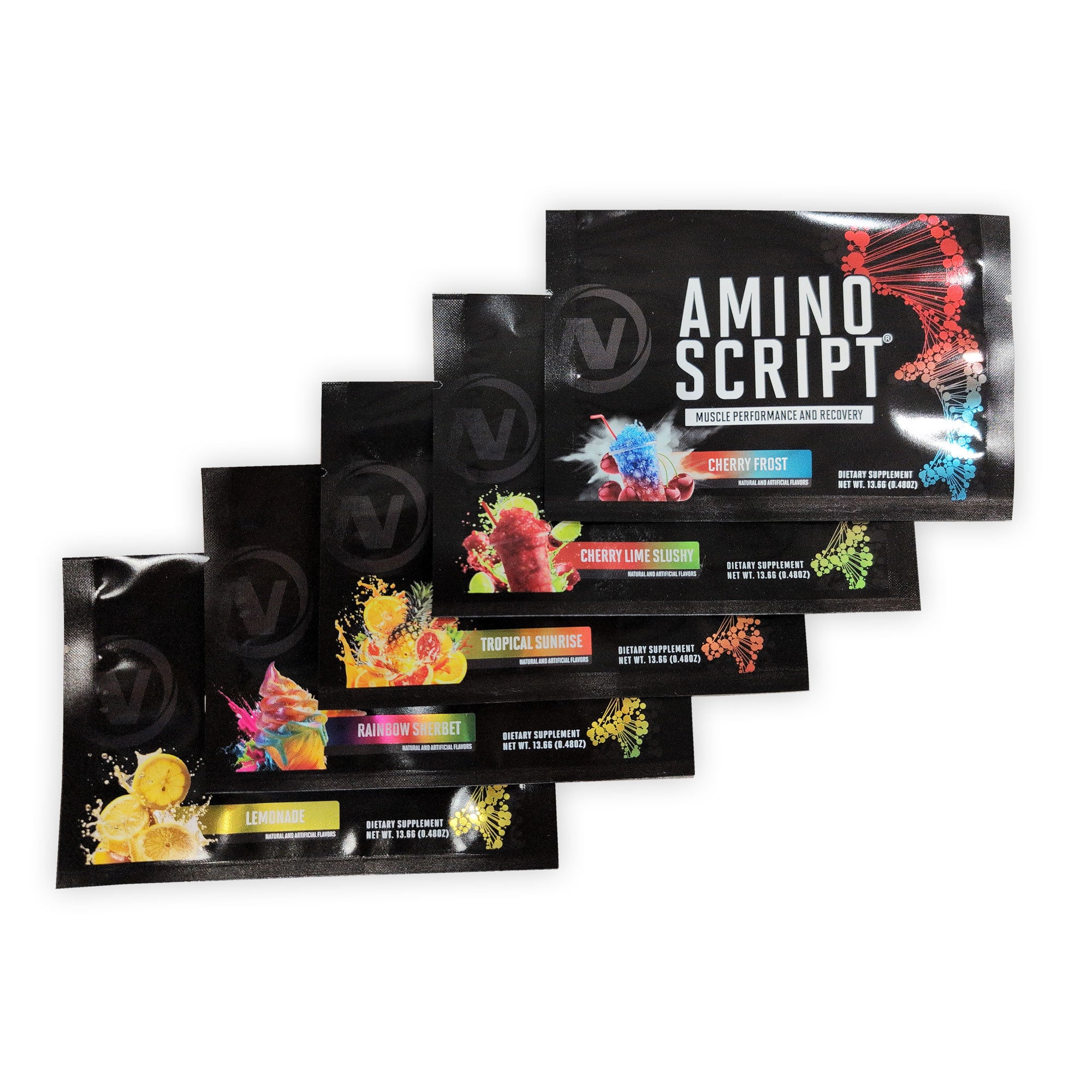 Try Our Amino Script® today! Shipped Free For Only $4.99. Flavors in bundle - Rainbow Sherbet, Tropical Sunrise, Lemonade, Cherry Lime Slushy, Cherry Frost.